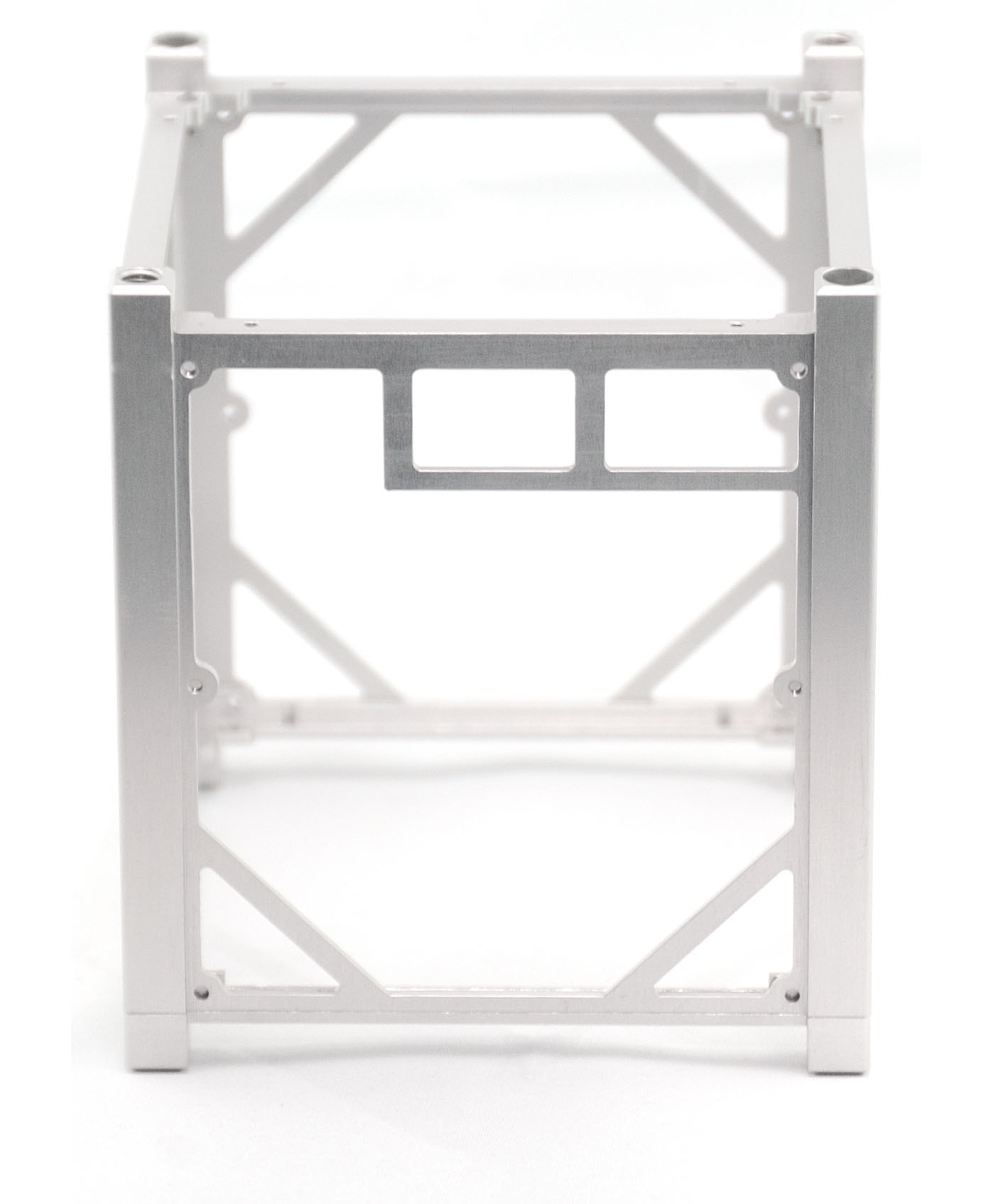 The measurements of the frame are according to cubesat standard for one unit cubesat. It is resistant to high vibration and is made of one piece of aluminium.