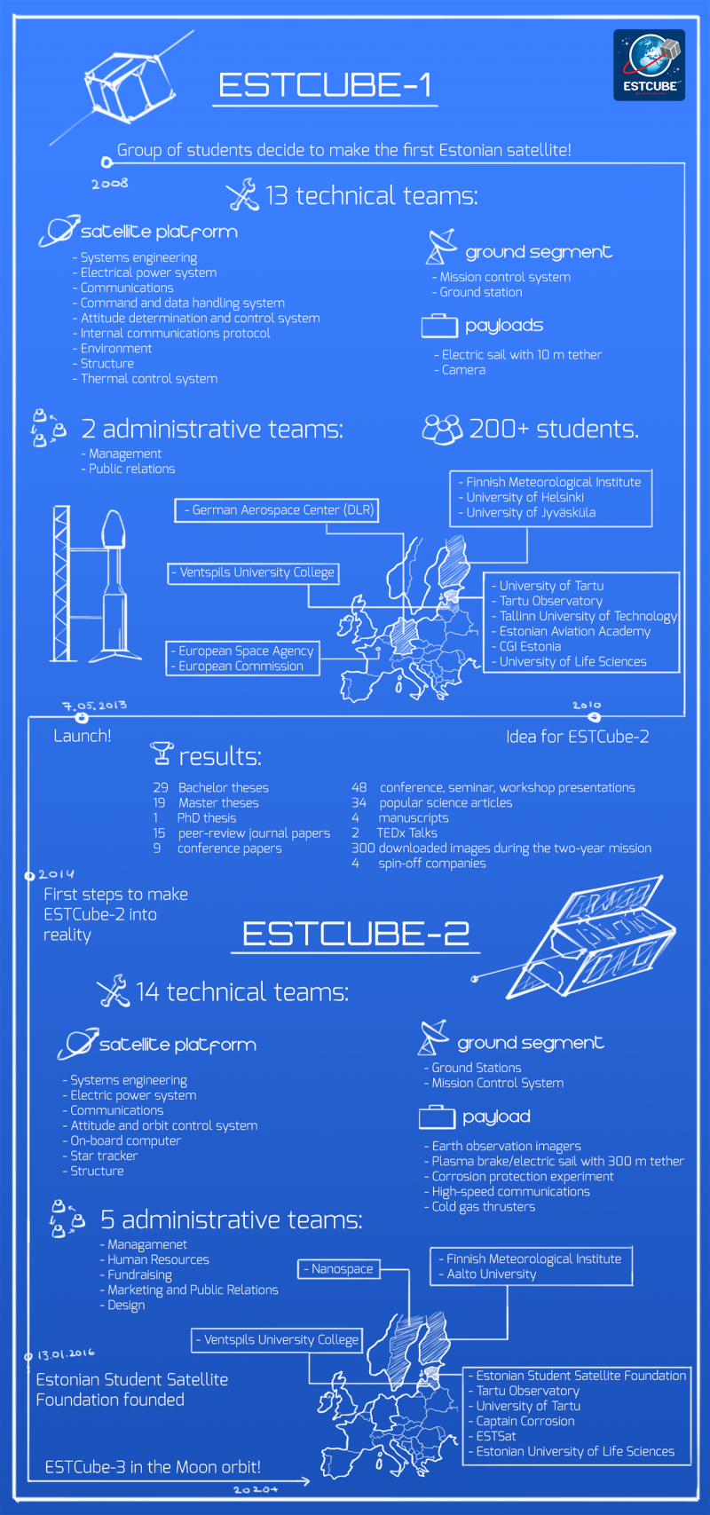 Silver Lätt, Andris Slavinskis, Erik Ilbis, Urmas Kvell, Kaupo Voormansik, Erik Kulu, Mihkel Pajusalu, Henri Kuuste, Indrek Sünter, Tõnis Eenmäe, Kaspars Laizans, Karlis Zalite, Riho Vendt, Johannes Piepenbrock, Ilmar Ansko, Ahto Leitu, Andres Vahter, Ants Agu, Elo Eilonen, Endel Soolo, Hendrik Ehrpais, Henri Lillmaa, Ivar Mahhonin, Jaak Mõttus, Jaan Viru, Jaanus Kalde, Jana Šubitidze, Jānis Mucenieks, Jānis Šate, Johan Kütt, Juris Poļevskis, Jürgen Laks, Kadi Kivistik, Kadri-Liis Kusmin, Kalle-Gustav Kruus, Karl Tarbe, Katrin Tuude, Katrīna Kalniņa, Laur Joost, Marko Lõoke, Markus Järve, Mart Vellak, Martin Neerot, Martin Valgur, Martynas Pelakauskas, Matis Averin, Mats Mikkor, Mihkel Veske, Ott Scheler, Paul Liias, Priit Laes, Ramon Rantsus, Reimo Soosaar, Risto Reinumägi, Robert Valner, Siim Kurvits, Sven-Erik Mändmaa, Taavi Ilves, Tanel Peet, Tavo Ani, Teet Tilk, Timothy Henry Charles Tamm, Tobias Scheffler, Toomas Vahter, Tõnis Uiboupin, Veigo Evard, Andreas Sisask, Lauri Kimmel, Olaf Krömer, Roland Rosta, Pekka Janhunen, Jouni Envall, Petri Toivanen, Timo Rauhala, Henri Seppänen, Jukka Ukkonen, Edward Haeggström, Risto Kurppa, Taneli Kalvas, Olli Tarvainen, Janne Kauppinen, Antti Nuottajärvi, Hannu Koivisto, Sergiy Kiprich, Alexander Obraztsov, Viljo Allik, Anu Reinart, Mart Noorma (2014). ESTCube-1 nanosatellite for electric solar wind sail in-orbit technology demonstration. Proceedings of the Estonian Academy of Sciences, 63 (2S), 200-209.