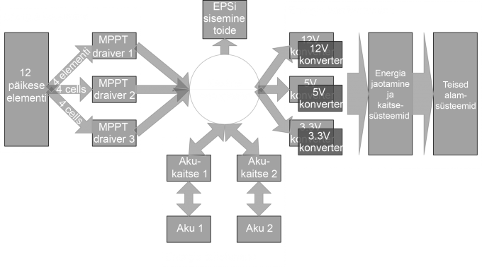 Elektrienergia alamsüsteem (EPS - ingl. k. Electrical Power System) korjab energiat päikesepaneelidelt, kogub seda akudesse ja jaotab vastavalt vajadusele laiali kogu satelliidile. Ülaloleval pildil on toodud alamsüsteemi lihtsustatud skeem, mis kujutab süsteemi erinevaid osasid ja energia liikumist nende vahel. Lisaks energia laialijaotamisele juhib EPS kogu satelliiti missiooni algfaasis ja hiljem hädaolukordade korral. Kuna süsteem peab toimima elektroonikale väga ebasõbralikus keskkonnas (kõrge kiirgustase, vaakum), on sellesse kavandatud mitmeid kaitselahendusi. Näiteks on paljud olulised komponendid dubleeritud ja ahelates on palju elektroonilisi voolupiirajaid, mis kaitsevad süsteemi lühiste eest. Selle alamsüsteemi abil saadab satelliit ka majakasignaali.